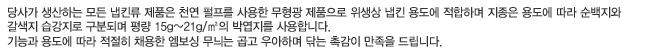 습강지에 전체 엠보싱을 넣어 얇고 부드러워 흡수성이 좋고 테이블용 냅킨케이스와 벽걸이용 냅킨 디스펜서에 넣어 한 장씩 뽑아쓰는 냅킨 으로 불필요한 소모를 줄임으로서 경제적이고 간편합니다. 일반음식점이나 단체급식소에서 요즘 가장 많이 사용합니다.